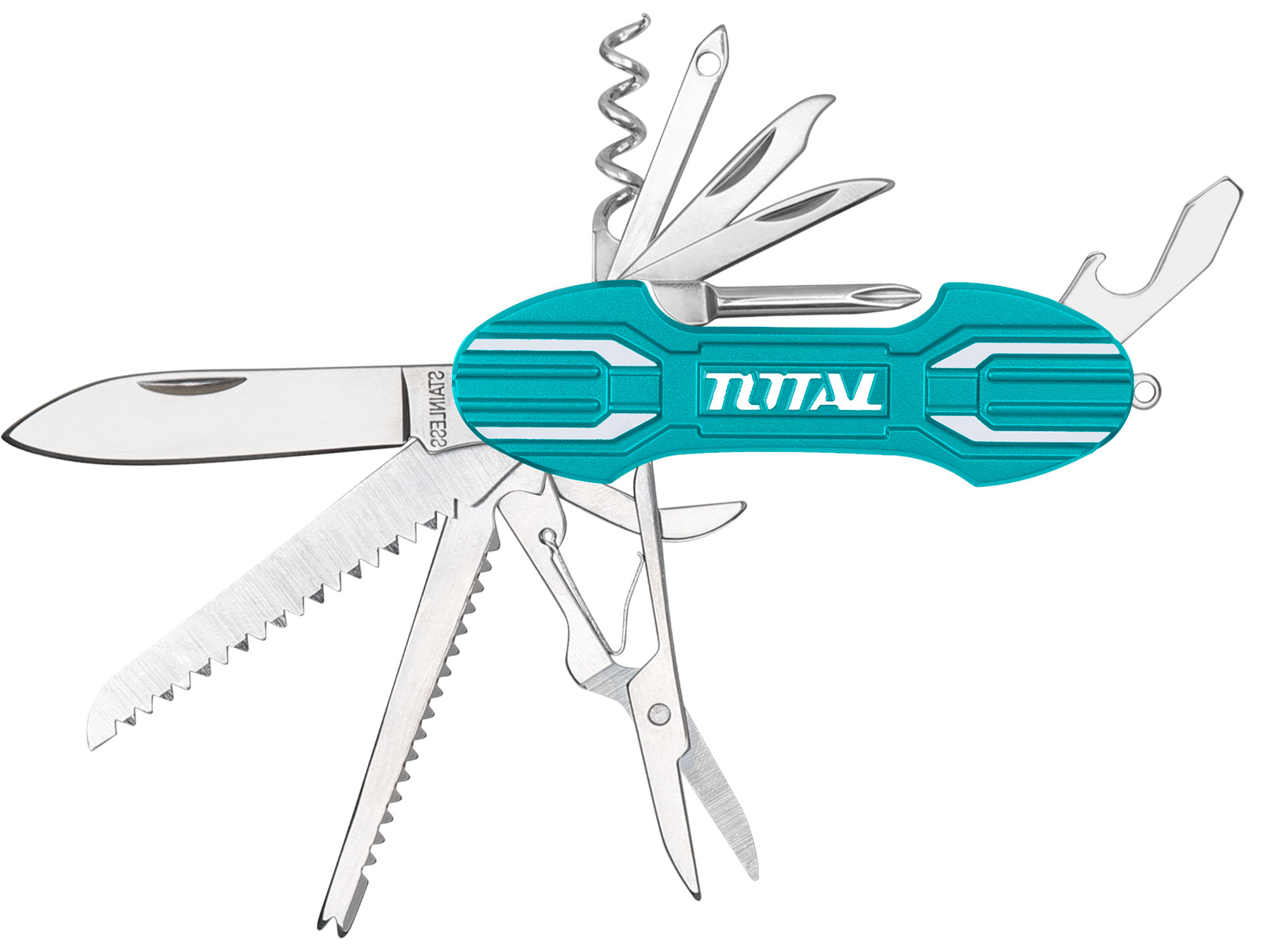 Makas, yüksek kaliteli paslanmaz çelikten yapılmıştır ve bu sayede sağlam ve dayanıklıdır. Bıçak, makas, yıldız tornavida, eğe, konserve açacağı, şişe açacağı, tirbuşon, testere, balık ölçekleyici, kanca çıkarıcı, tığ, tırnak temizleyici, tırnak törpüsü, cetvel ve anahtarlık gibi çeşitli işlevlere sahiptir.