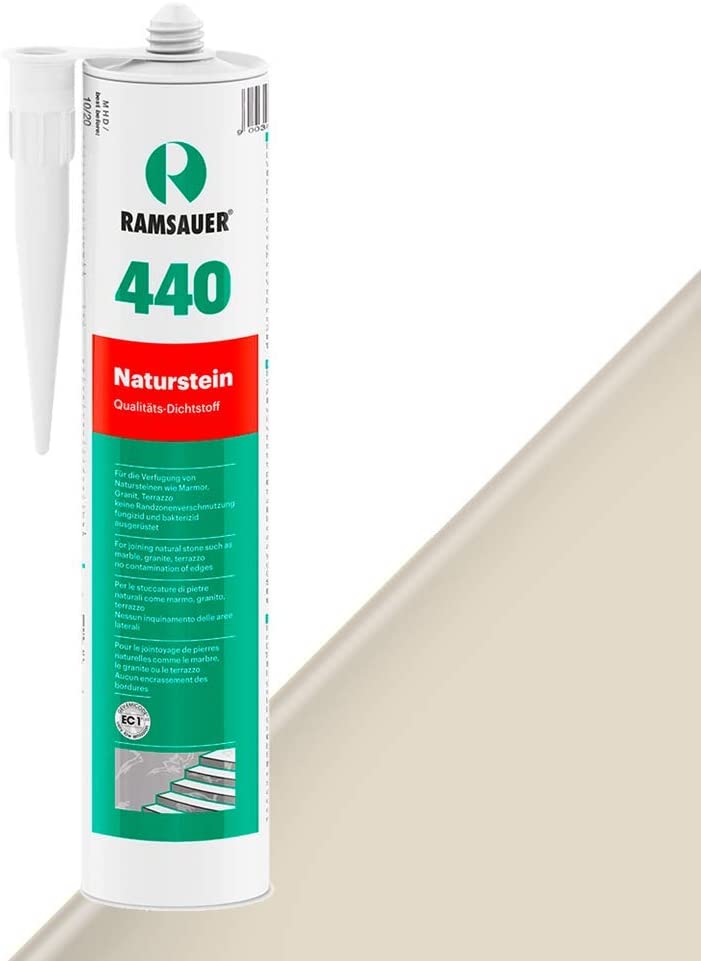 Ramsauer Naturstein 440, 310 ml, jasmin ist ein speziell entwickelter Dichtstoff für die Verfugung von Natursteinen wie Marmor, Granit, Terrazzo, usw. Im Gegensatz zu herkömmlichen Silikondichtstoffen tritt bei Kontakt mit diesen Baustoffen keine Randzonenverschmutzung auf. NATURSTEIN 440 enthält fungizide und bakterizide Wirkstoffe und ist gegen die handelsüblichen Reinigungs- und Desinfektionsmittel beständig. NATURSTEIN 440 ist geeignet für den Einsatz bei stark belasteten Fugen sowie im Unterwasserbereich.