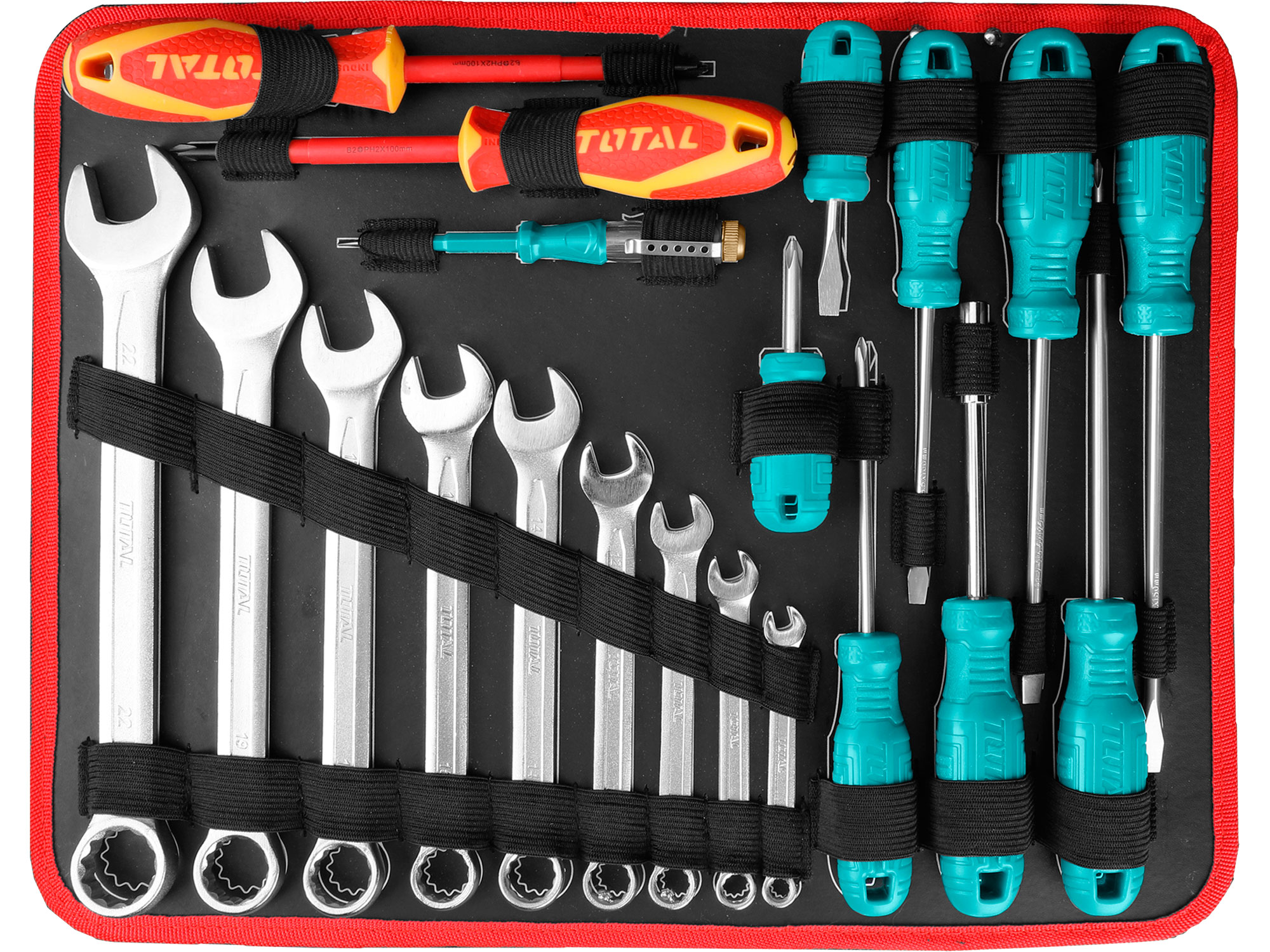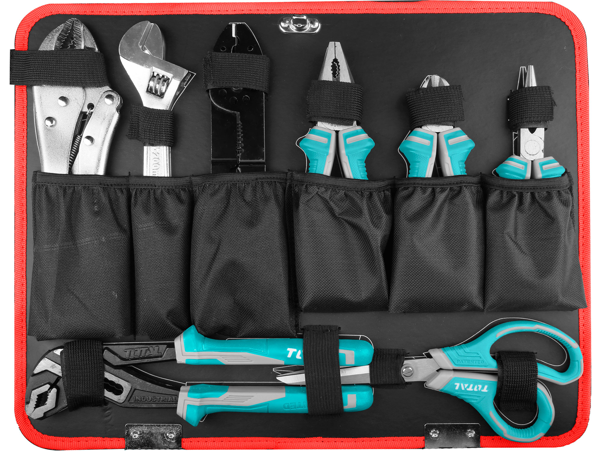 Pense: 180 mm kombine, 160 mm yarım yuvarlak düz ve 160 mm kesici kenar, 1 çift SIKO pense 250 mm, 1 çift hızlı açılan pense 250 mm, 1 çift tel sıyırıcı 200 mm
