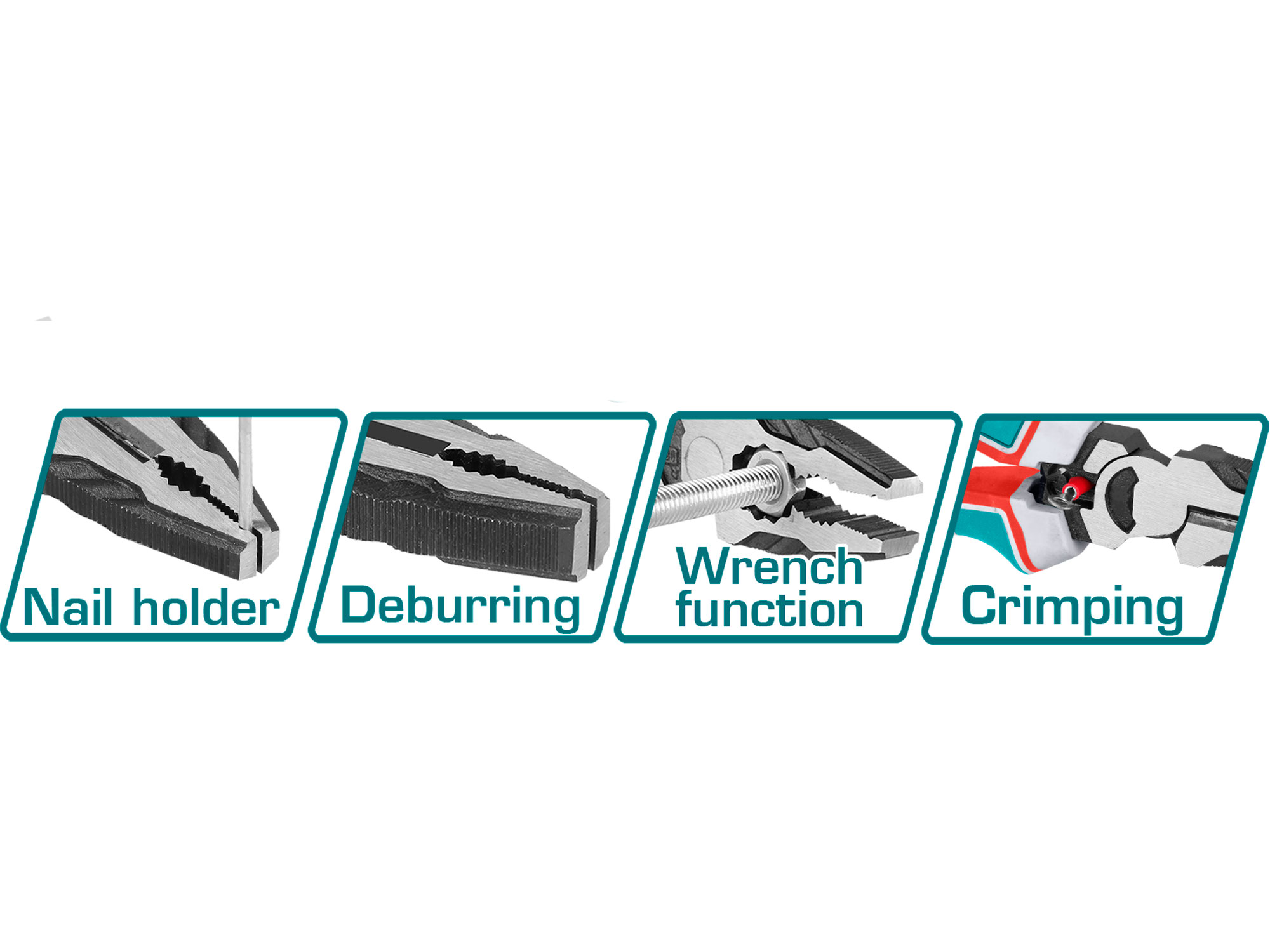 Total Bu 3'lü pense seti, endüstriyel kullanım için özel olarak tasarlanmış ve üretilmiştir. Yüksek kaliteli indüksiyonla sertleştirilmiş CrV çelikten yapılmış çenelerden oluşur. Metal, dayanıklılığını ve uzun ömürlülüğünü artırmak için özel olarak işlenmiştir ve temiz ve profesyonel bir görünüm sağlamak için kenarları parlatılmıştır.