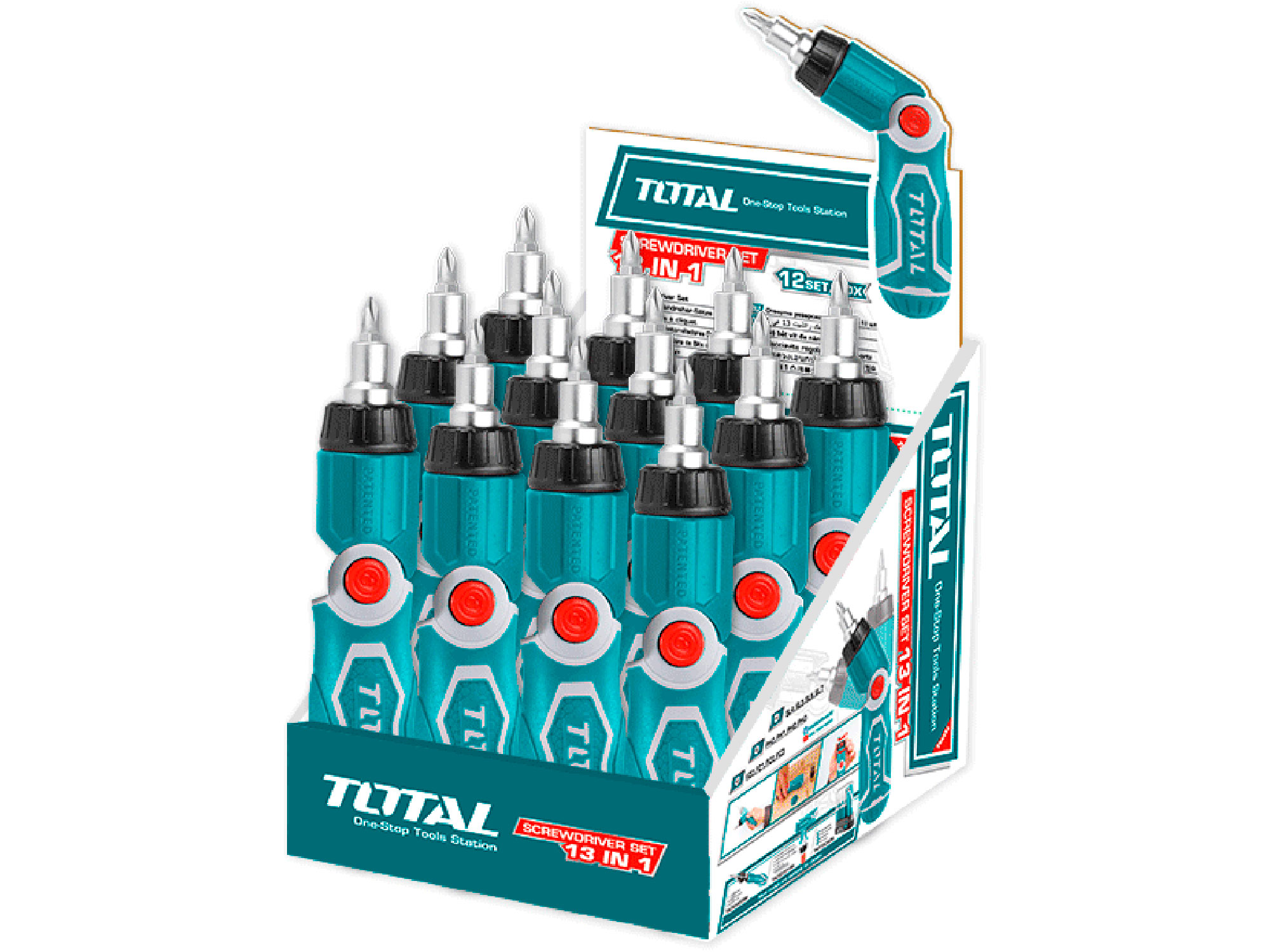 Total 13'ü 1 arada tornavida seti kompakt ve hafif olduğundan saklaması ve taşıması kolaydır. Atölyede, evde veya şantiyede kullanım için idealdir. Paranızın karşılığını mükemmel bir şekilde verir ve her alet kutusu için vazgeçilmez bir araçtır.