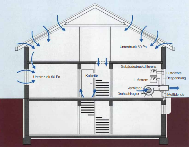 Hava geçirgenliğini ölçme prensibi. Pencereler ve kapılar kapalıyken, fanın hızı, aşağıdaki değerlerde bir bina basınç farkı oluşana kadar artırılır Örneğin 50 Pa bina basınç farkı. Okunacak hacimsel akış, hava geçirgenliğinin hacimsel akışı olarak adlandırılır .
