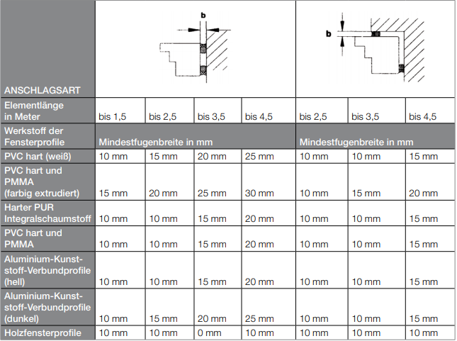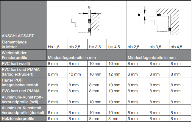 Önceden sıkıştırılmış sızdırmazlık bantlarının boyutlandırılmasında mümkün olduğunca az hata yapılmasını sağlamak için aşağıdaki tablo ift Rosenheim tarafından hazırlanmıştır . Tablo 1 ile Tablo 2'nin karşılaştırılması , sızdırmazlık bantları kullanıldığında derzinmacun kıvamındaki sızdırmazlık maddelerine göre daha dar yapılabileceğini göstermektedir. Bu, sızdırmazlık bantlarının açık bir ekonomik avantajıdır.
